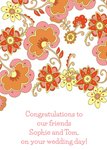 Brightly illustrated floral patterns with text underneath. Text reads:"congratulations to our friends sophie and tom,on your wedding day" text can be edited