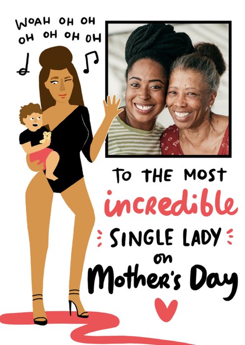 Photo upload card with an illustration of a 'single lady' holding a baby with fun handwritten type besides.