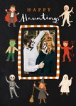 Featuring playful Halloween characters including a vampire, mummy, Frankenstein, devil, skeleton, witch and ghost, around a striped frame on a black coloured background.
