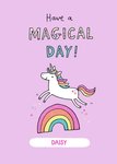 Jenny Seddon Illustrated unicorn jumping over a rainbow, on a pink background. The caption reads Have A Magical Day! Editable Name