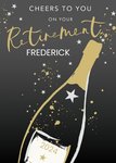 Front of card: On Your Retirement Card Illustration of a bottle of wine. Text reads: "Cheers to you on your retirement Frederick 2023". 'Frederick 2023' can be personalised!