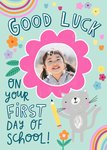Front of card: First Day Of School Photo Upload Card Illustration of a cat with colourful flowers on a teal background. Text reads: "Good luck on your first day of school!".