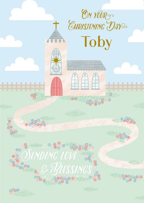 Front of card: Christening Day Card Illustration of a Christian church surrounded by flowers. Text reads: "On your Christening day Toby" and "Sending love & blessings". 'Toby' can be personalised!
