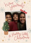 Front of card: Photo Upload Christmas Card Illustration of a christmas tree with a photo frame surrounded by stars and snowflakes. Text reads: "Have yourself a merry little Christmas".