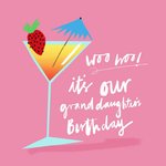 Front of card: Granddaughter's Birthday Card Illustration of a cocktail with handwritten typography on a pink background. Text reads: "Woo hoo! it's our granddaughters birthday".