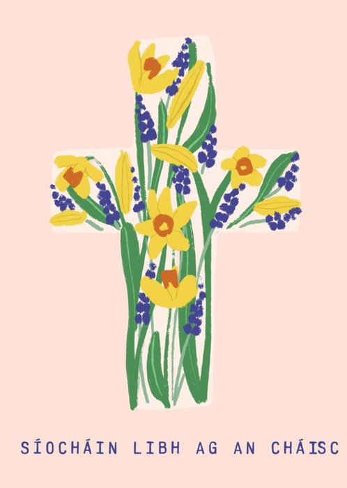 Illustration of a cross decorated with daffodils and bluebells with Irish text on a cream background.