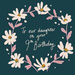 Front of card: Daughter's 9th Birthday Card Illustration of a daisy chain surrounding handwritten typography. Text reads: "To our daughter on your 9th birthday".