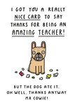 "I got you a really nice card to say thanks for being an amazing teacher! But the dog ate it. Oh well, thanks anyway Mr Teacher!". 'But the dog ate it. Oh well, thanks anyway Mr Teacher!' can be personalised!