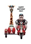 Front of card: Biker Birthday Card Beautifully illustrated art of a hippopotamus riding a classic motorbike with a giraffe in a sidecar sporting motorbike gear. Text reads: "Happy Birthday Percy". 'Percy' can be personalised!