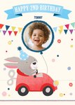 Front of card: 2nd Birthday Photo Upload Card Illustration of a rabbit in a car with a photo frame balloon. Text reads: "Happy 2nd birthday Tommy". 'Tommy' can be personalised!