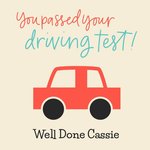 Front of card: Driving Test Congratulations Card Illustration of a red car on a cream background. Text reads: "You passed your driving test!" and "well done Cassie". 'Well done Cassie' can be personalised!