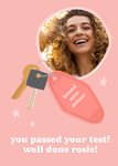 Front of card: Brand New Driver Photo Upload Congratulations Card Illustration of a set of car keys and a circular photo frame on a pink background. Text reads: "Brand new driver" and "you passed your test! well done rosie". All text can be personalised!