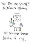 Front of card: 'You're the best!' Humourous Card Illustration of a unicorn. Text reads: "You may have stopped believing in Unicorns", "you're the best" and "but they never stopped believing in you!".
