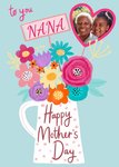 Front of card: Mother's Day Photo Upload Card Illustration of a vase of colourful flowers. Text reads: "To you Nana happy Mother's Day". 'Nana' can be personalised!