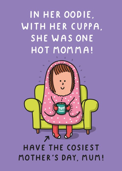 Front of card: Humorous Photo Upload Mother's Day Card Illustration of a woman wearing an oodie drinking tea. Text reads: "In her oodie, with her cuppa, she was one hot momma!" and "have the cosiest Mother's Day, Mum!".