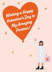 Front of card: Happy Valentine's Day Card Illustration of a woman with a very large heart shaped balloon. Text reads: "Wishing a happy Valentine's Day to my amazing partner!".