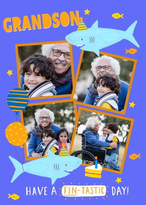 Illustration Of Sharks In Party Hats With Four Photo Frames Grandson's Photo Upload Birthday Card