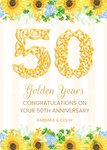 Front of card: Golden Years Anniversary Card Illustration of sunflowers and shamrocks with a Celtic knot styled number 50 on a striped background. Text reads: "50 Golden Years congratulations on your 50th Anniversary Barbara & Colin". 'Golden Years congratulations on your 50th Anniversary Barbara & Colin' can be personalised!