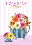 Front of card: Just a Note to Say Card Illustration of tea kettle and teacup bursting with flowers on a pink and white striped background with Irish language text in Pink and orange. Text reads: "Nóta Beag". "Róisín". All text can be personalised!