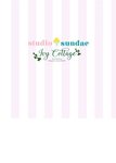 Back of card: Studio Sundae, Ivy Cottage logo on a pink and white striped background.