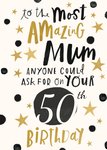 Front of card: Illustrative typography in center surrounded by black and gold stars and spots on a cream background. Text reads: "To the most amazing Mum anyone could ask for on your 50th birthday" With customisable age.
