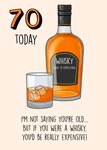 Poppy and Mabel illustration of a bottle of Whisky and a glass with ice and Whisky in it. The card background colour is cream. The non editable caption reads 70 Today I'm Not Saying Your Old But If You Were A Whisky, You'd Be Really Expensive.