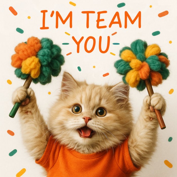 Featuring a fluffy ginger cat wearing an orange top and holding two green orange and yellow pom poms with scattered confetti on a pale cream background.