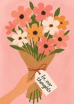 Featuring an illustrated hand holding a brown paper-wrapped bouquet of simple flowers in pink, orange, and white on a greeting card, set against a soft pink background.