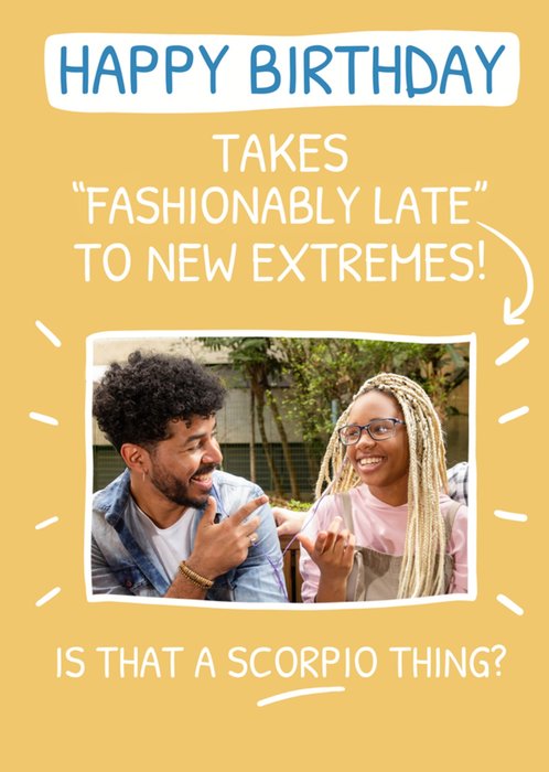 Front of card: Featuring white handwritten typography with a photo frame on a yellow background. Text reads: "Happy birthday takes fashionably late to new extremes! Is that a Scorpio thing?".