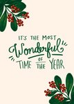 Front of Card: Illustrated green text on a cream off-white background, with green and red illustrations of mistletoe. The card reads: "Its The Most Wonderful Time Of The Year'".