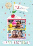 Front of card: A sweet and fun Photo Upload Birthday card featuring an illustrated Birthday cake slice with sprinkles and a smiling cherry character on top. There is also a sparkler and flag coming out of the top of the cake. The two photo upload areas are rectangles inside the side of the slice of cake. In the background, there are stars and confetti.