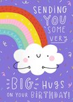 Front of card: Illustration of rainbow and cloud surrounded by confetti and gifts on a purple background Text reads: "Sending you some very big hugs on your birthday!"