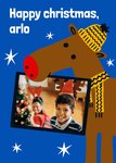 Front of card: A cute and festive Christmas card featuring a hand-drawn cartoon of a cheerful reindeer holding in its mouth a picture frame with one photo upload area. There are stars in the background.