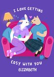 This cosy card design features a rabbit and a bear cuddling on a pink sofa, both dressed in comfortable loungewear, with the text “I love getting cosy with you” and an area to edit the name above, creating a warm and affectionate atmosphere perfect for expressing love. All on a warm purple-coloured background.