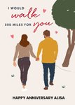 Just Peachy simple illustration of a couple out walking with a tree and lovehearts. The non editable typographic caption reads I Would Walk 500 Miles For You, followed by the editable Happy Anniversary recipient's name. The card background colour is cream.