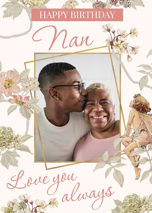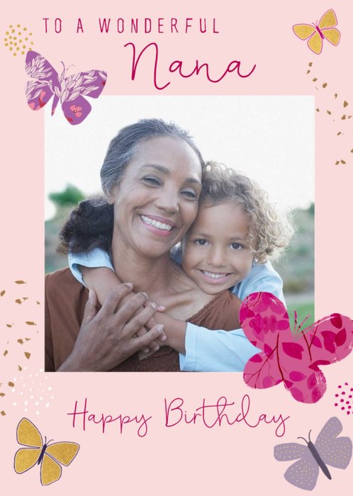 This greeting card design features a bold and vibrant background with striped lines in various colours. The photo upload area is shaped like an inverted triangle at the bottom centre of the card. The text on the card reads, “Amazing Granny Happy Birthday!”