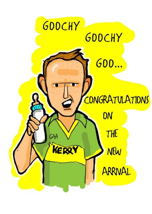 Illustration of gaelic footballer Kerry holding a babies bottle. With text on right hand side.