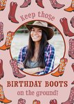 Featuring a circular photo frame surrounded by colourful cowboy boots. With a fun, cheeky message, it's perfect for a birthday celebration.