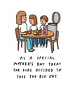 A humorous Mother's Day card featuring an illustration of a mum and her kids sitting at a table enjoying tea and cake. The joke is that as a special Mother's Day treat, the kids decided to take the bin out—while leaving it next to the table. A playful and cheeky card perfect for mums with a great sense of humour.