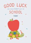 Text reads: "GOOD LUCK ON YOUR FIRST DAY OF SCHOOL TOBY" with editable name text.