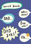 A bold and playful Father's Day card with a series of illustrated speech bubbles on a deep blue background, delivering a classic knock-knock Dad joke. The final bubble ends in a dramatic "Oh..." moment, accompanied by a simple illustrated face for comic effect.