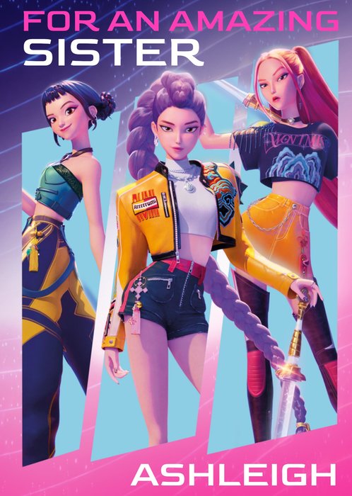 Featuring a KPop Demon Hunters greeting card showing Rumi, Zoey, and Mira in glittery black, gold, and white stage outfits on a black background with flowing gold lines.