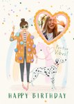 Front of card: Featuring an illustration of a lady wearing a pom pom jacket walking her dalmatian. They are surrounded by confetti and there is a watercolour rainbow behind them. There is a heart shaped photo upload in the top right of the card.