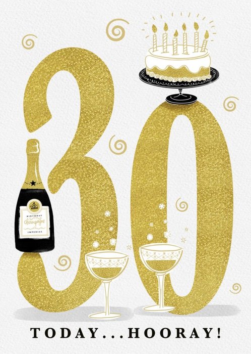 Large Golden Number With Illustrations Of Cake And Wine Thirtieth Birthday Card