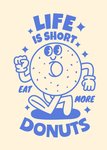 Front of card: Featuring a humorous and quirky illustration of a blue line-drawn cartoon doughnut character with sunglasses and a cheerful expression, surrounded by sparkles and a retro typeface on a cream background.