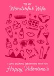 Front of Card: Illustration of glamour and beauty items on a pink background with white typography. Text reads: "To my Wonderful Wife I love sharing everything with you. Happy Valentine's"