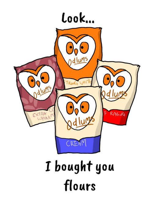 Featuring four illustrated flour bags with an owl face logo grouped in the centre on a greeting card, with black handwritten lettering on a plain white background.