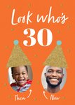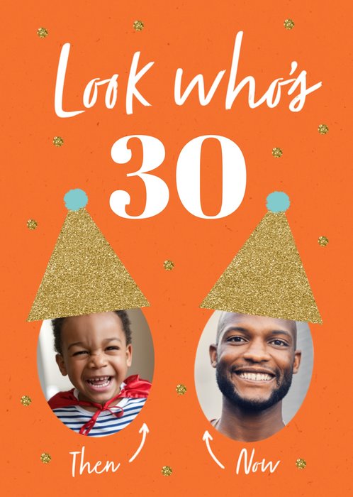 A modern, playful design featuring a 30th Birthday message with two oval photo upload frames underneath, labelled “Then” and “Now”. Both ovals are topped with glittery gold party hats adorned with pom-poms. The design sits on a warm orange background scattered with gold glittery dots.