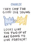 "Charlie they say the good die young looks like the two of us are going to live forever". 'Charlie' can be personalised!