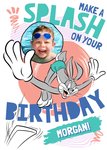 Front of card: Featuring an illustration of Bugs Bunny diving off a diving board. Text reads: "Make a splash on your birthday Morgan!". 'Morgan!' can be personalised!